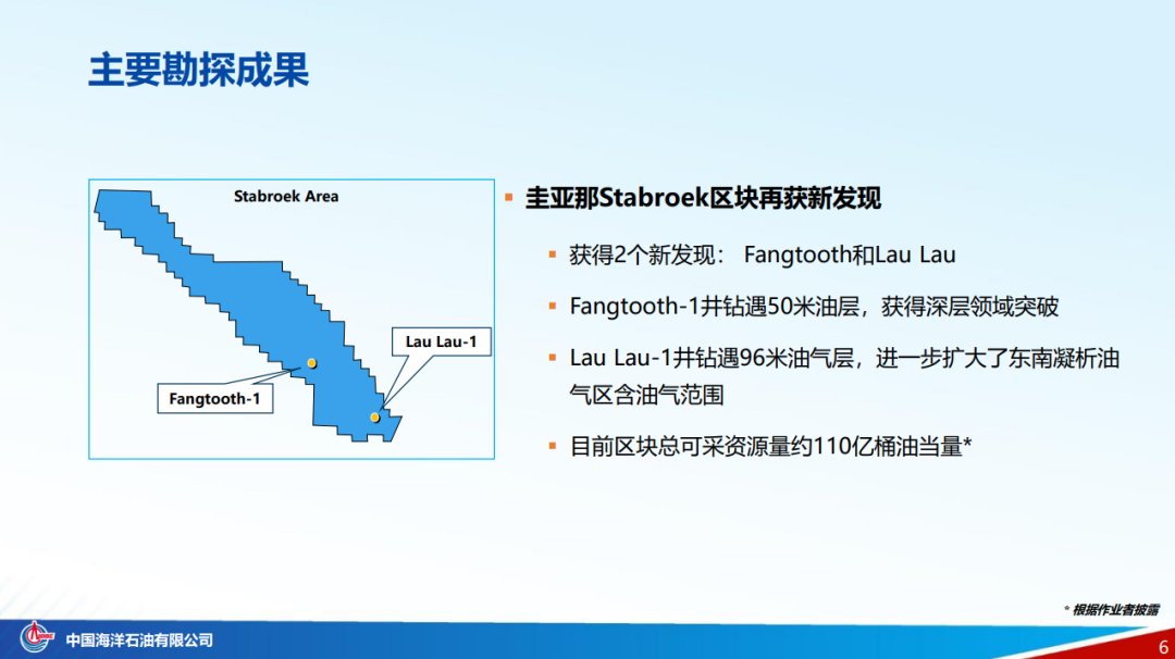 别的,,,,,,,,公司共获得4个新发明,,,,,,,,其中,,,,,,,,圭亚那Stabroek区块获得新发明Fangtooth和Lau Lau,,,,,,,,将总可采资源量提升到了约110亿桶油当量。。。。。。。。